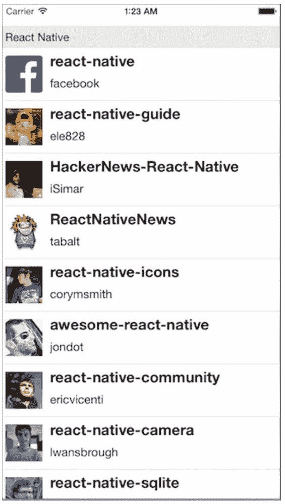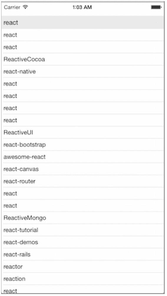 现在我们有了自己的数据,接下来我们让结果以列表形式呈现,在这个列表视图中,每一行都对应一条通过搜索 GitHub 返回的数据。开始吧!