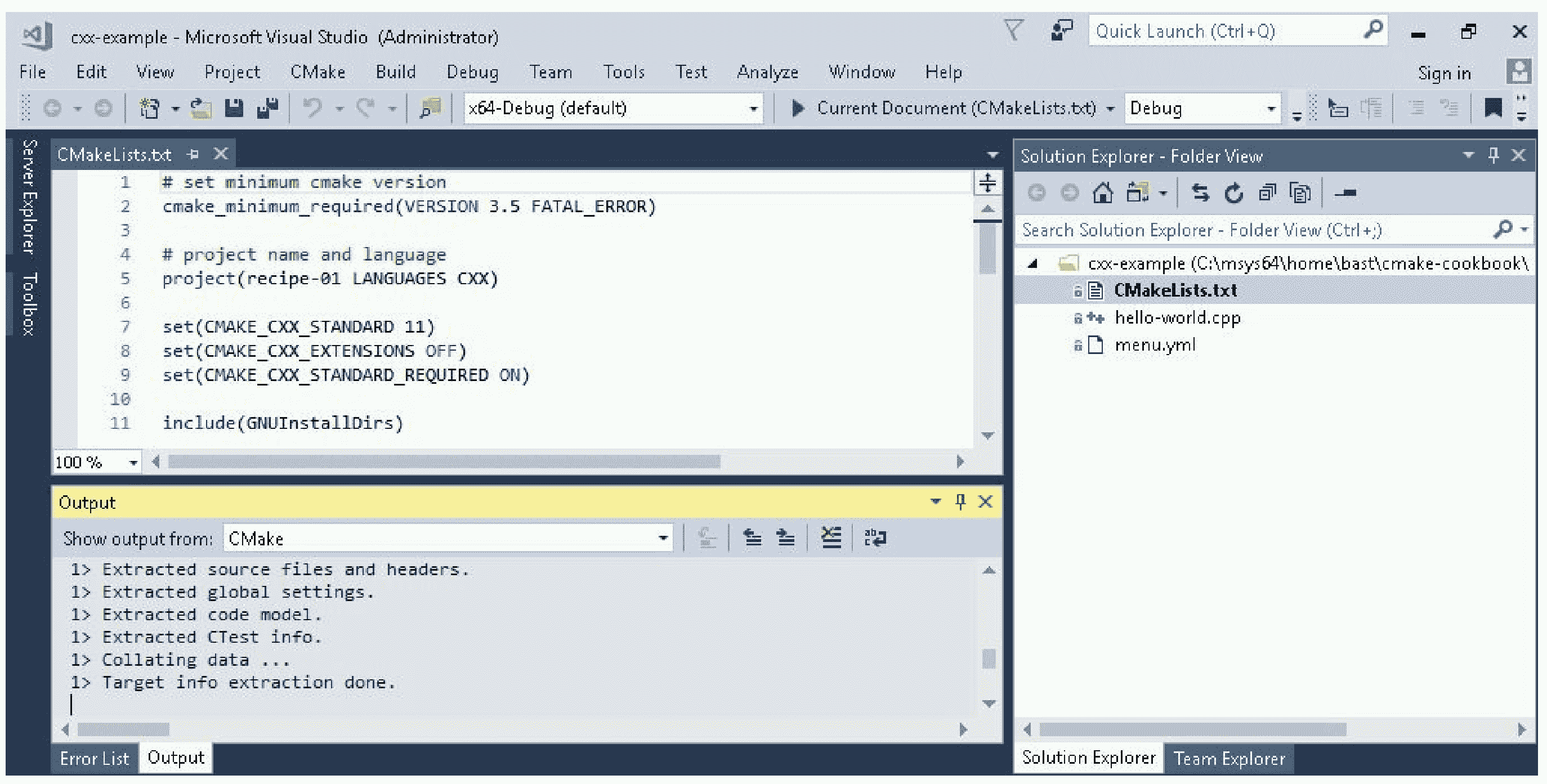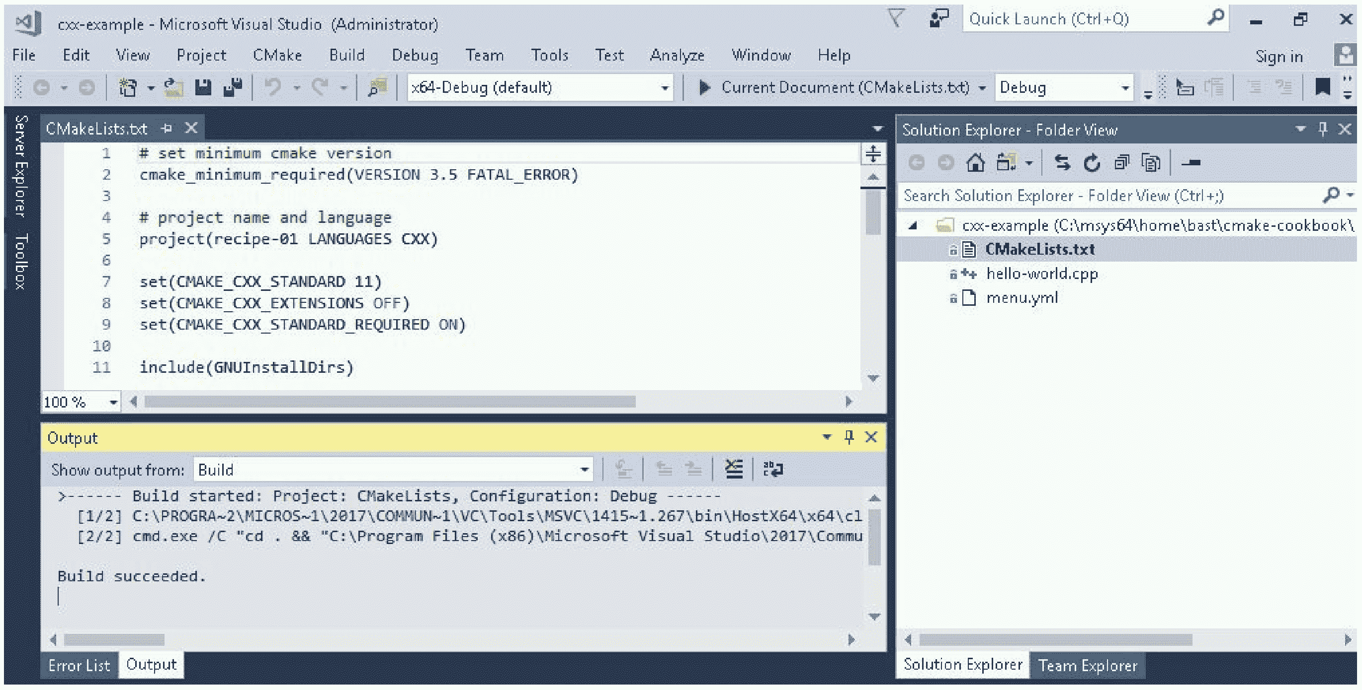 CMakeLists.txt文件,其内容为:# set minimum cmake version cmake_minimum_required(VERSION 3.5 FATAL_ERROR) # project name and language project(recipe-01 LANGUAGES CXX) set(CMAKE_CXX_STANDARD 11) set(CMAKE_CXX_EXTENSIONS OFF) set(CMAKE_CXX_STANDARD_REQUIRED ON) include(GNUInstallDirs) set(CMAKE_ARCHIVE_OUTPUT_DIRECTORY ${CMAKE_BINARY_DIR}/${CMAKE_INSTALL_LIBDIR}) set(CMAKE_LIBRARY_OUTPUT_DIRECTORY ${CMAKE_BINARY_DIR}/${CMAKE_INSTALL_LIBDIR}) set(CMAKE_RUNTIME_OUTPUT_DIRECTORY ${CMAKE_BINARY_DIR}/${CMAKE_INSTALL_BINDIR}) # define executable and its source file add_executable(hello-world hello-world.cpp) # we will print the system name in the code target_compile_definitions(hello-world PUBLIC "SYSTEM_NAME=\"${CMAKE_SYSTEM_NAME}\"" ) install( TARGETS hello-world DESTINATION ${CMAKE_INSTALL_BINDIR} ) - 打开 Visual Studio 2017,然后通过下面的