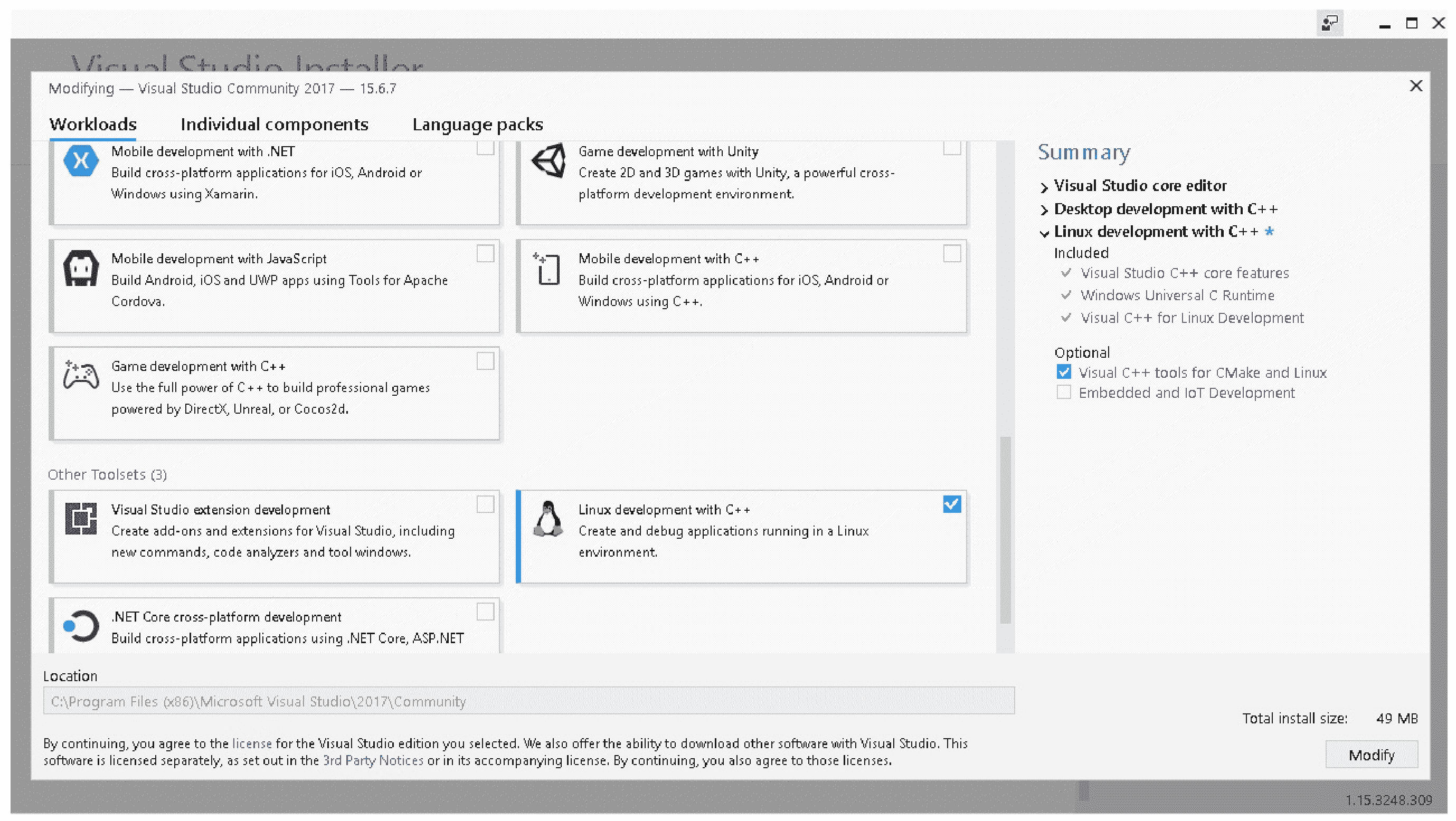 Visual Studio 2017 15.4 中,还可以为 Linux 平台进行构建。为此,在工具集中选择 Linux development with C++ :