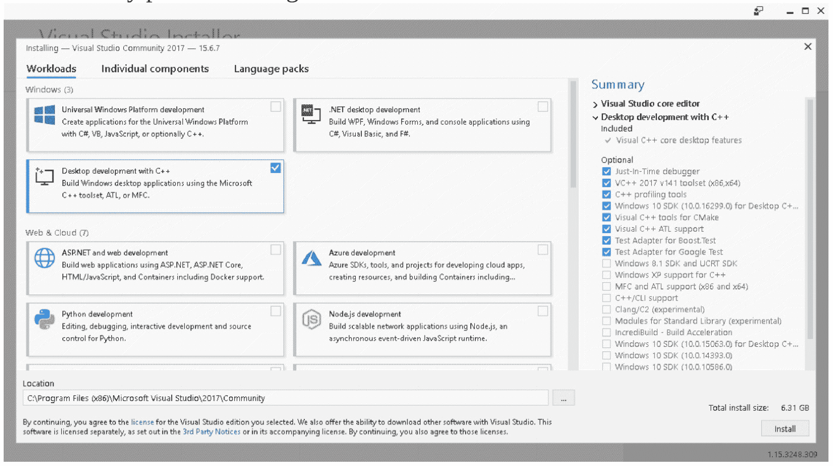 首先,下载并安装 Visual Studio Community 2017 ( https://www.visualstudio.com/downloads/ )。在撰写本文时,这个版本是免费的,有 30 天的试用期。我们将遵循的视频中的步骤: https://www.youtube.com/watch?v=_lKxJjV8r3Y