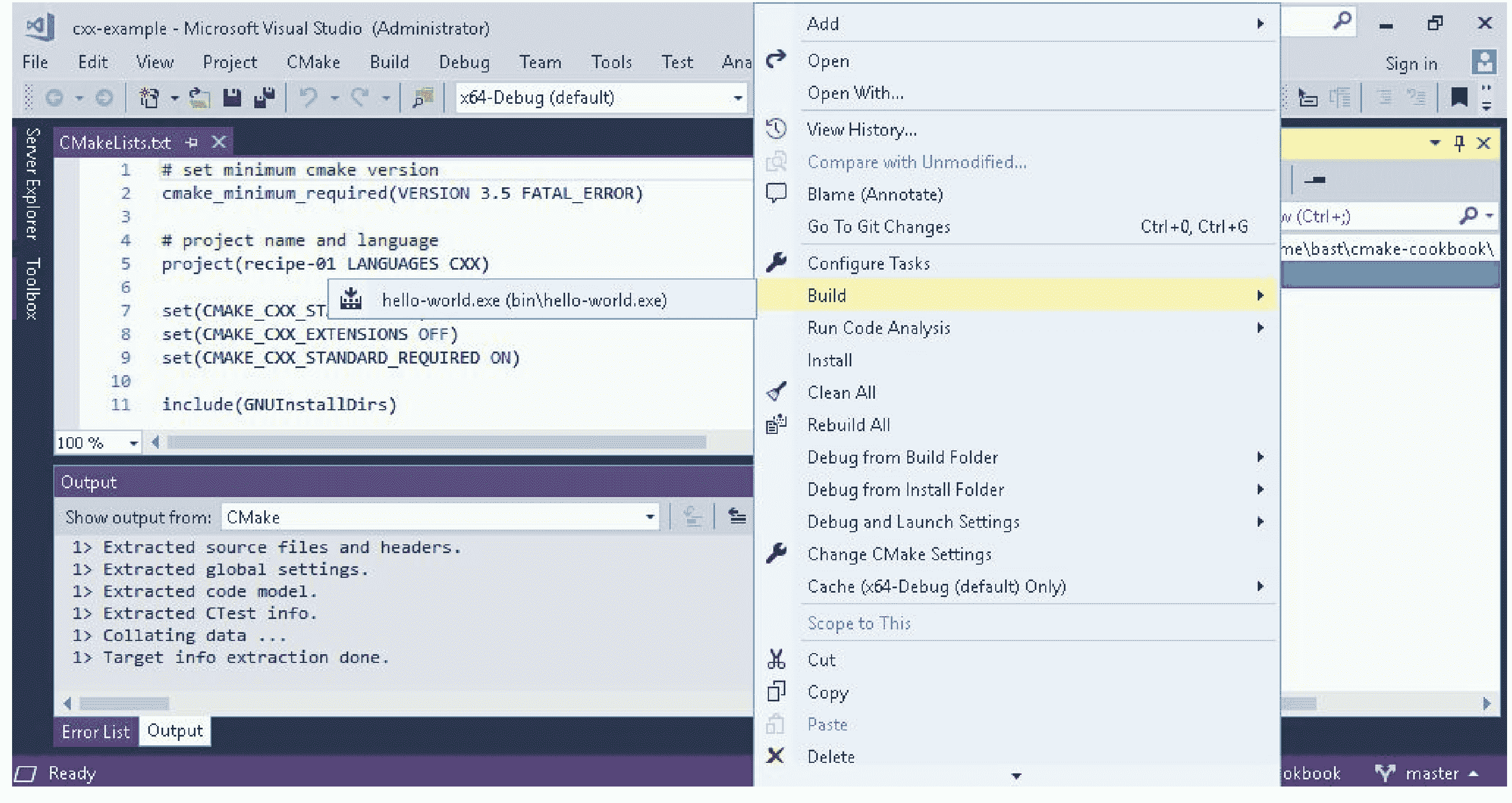 我们已经看到 Visual Studio 2017 能很好地对接 CMake,并且已经能够在 IDE 中配置和构建代码。除了构建步骤之外,还可以运行安装或测试步骤。可以通过右键单击 CMakeLists.txt (右面板),访问这些文件。