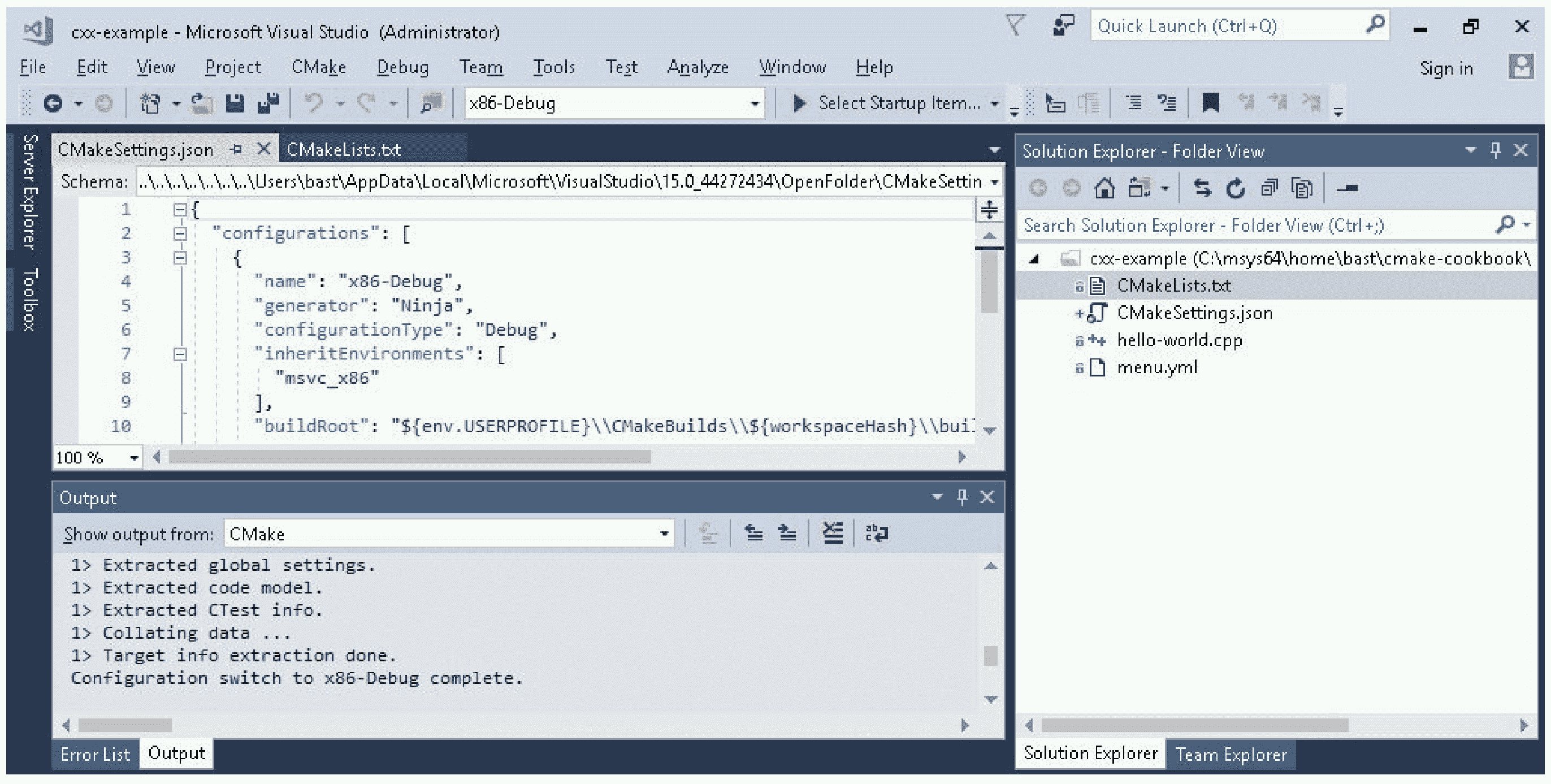 面板左上角,可以检查和修改生成器(本例中是 Ninja)、设置、参数以及路径。构建路径在前面的显示中可以看到。这些设置被分组为构建类型( x86-Debug 、 x86-Release 等等),我们可以在面板栏顶部的中间部分,通过选择切换构建类型。