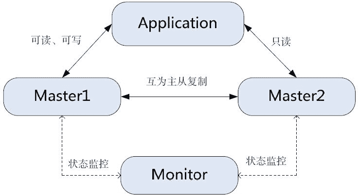 双 Master 节点的 MySQL 应用架构与 13.2 节介绍的 MySQL 双主架构完全相同,所不同的是这里的双 Master 架构是通过 MMM 管理套件实现的,而前面介绍的双主架构是通过 Keepalived 实现的。