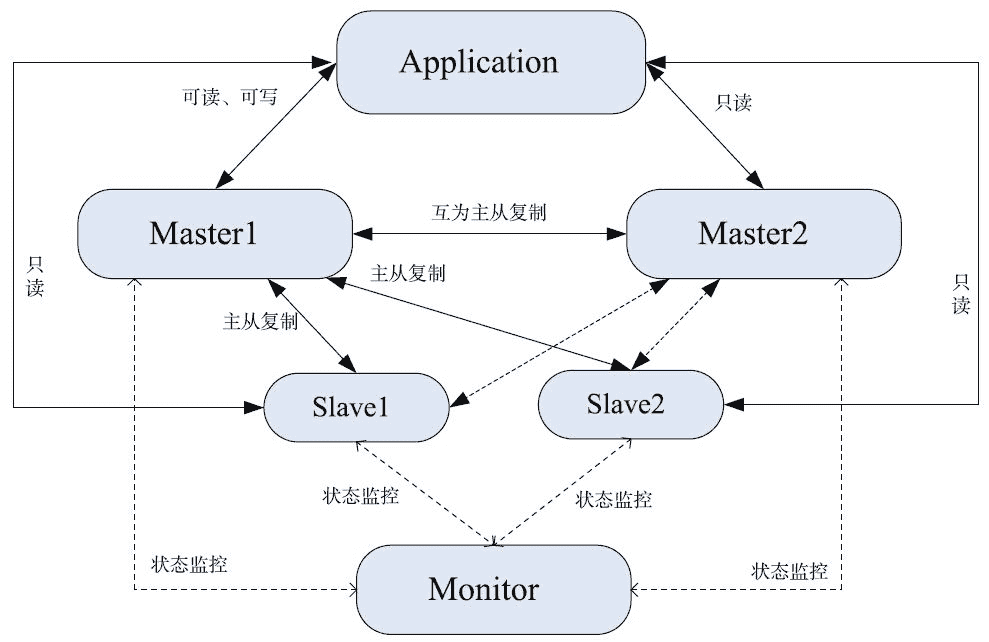 双主多从节点的 MySQL 架构适合读查询量非常大的业务环境,通过 MMM 提供的 reader IP 和 writer IP 可以轻松实现 MySQL 的读、写分离架构。此架构通过两个 Master 实现 MySQL 写操作的高可用,然后在 Master 后端又增加了多个 Slave 节点,所有的 Slave 节点只能进行读查询操作,而多个 Slave 节点之间可以通过 LVS、HAProxy 等负载均衡软件实现 MySQL 读操作的负载均衡。