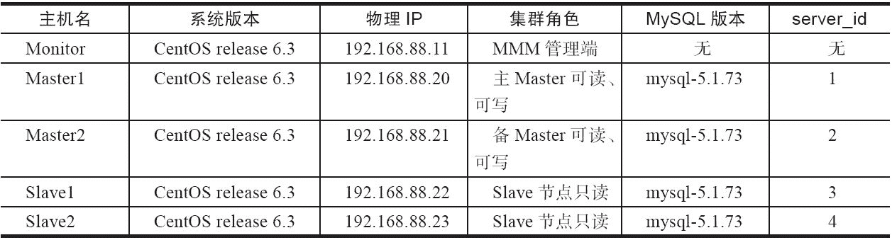 此架构需要 5 台独立的服务器,其中一台 MMM 管理节点,两台 MySQL 的 Master 节点,还有两台 MySQL 的 Slave 节点,服务器配置环境如表 13.2 所示。