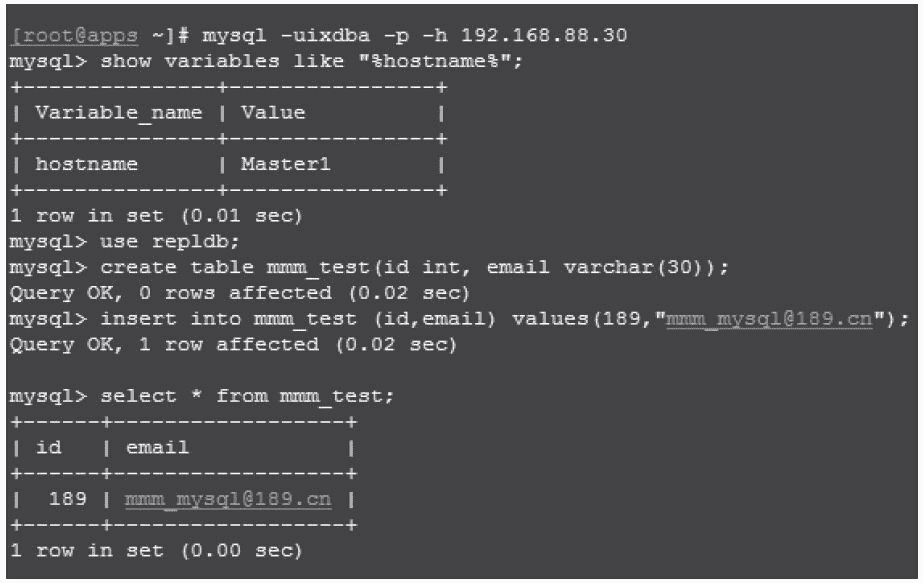 为了确保 MMM 集群已经正常运行,下面重点测试一下 MMM 所实现的读、写分离功能和故障转移功能。
