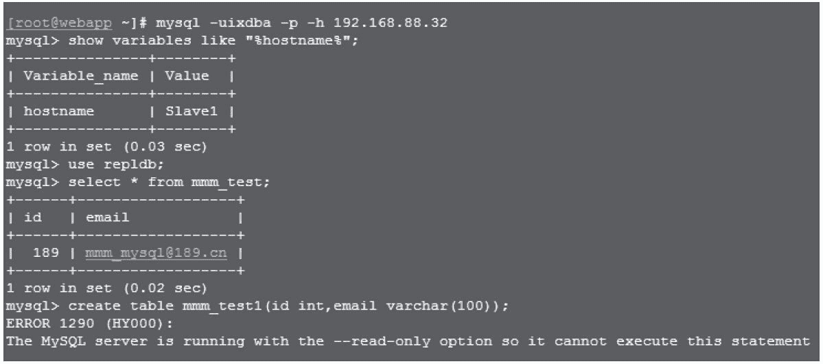 在这个操作过程中,通过只读虚拟 IP 地址“192.168.88.32”登录了 Slave1 主机,并且在 Master1 节点创建的表 mmm_test 已经同步过来。最后尝试在 Slave1 上创建表 mmm_test1 时,发生错误,提示 Slave1 节点设置了只读模式。这刚好实现了读、写分离的限制,由此可知,MMM 集群不但实现了数据的同步,而且通过可写 VIP 及只读 VIP 实现了读、写分离的功能。
