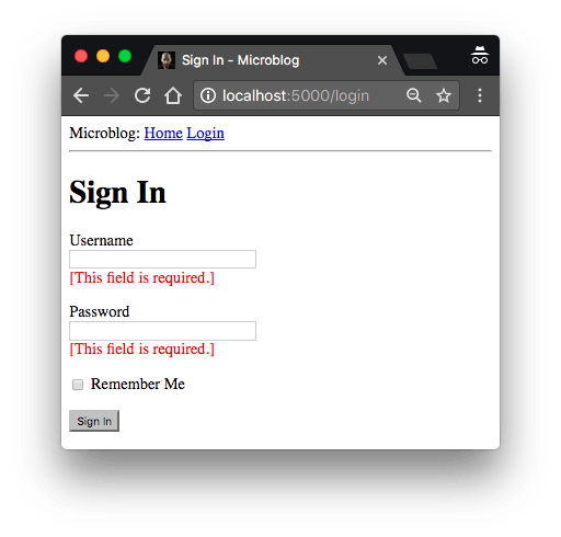 我做的唯一的改变是,在 username 和 password 字段之后添加 for 循环以便用红色字体来渲染验证器添加的错误信息。通常情况下,拥有验证器的字段都会用 form.<field_name>.errors 来渲染错误信息。 一个字段的验证错误信息结果是一个列表,因为字段可以附加多个验证器,并且多个验证器都可能会提供错误消息以显示给用户。