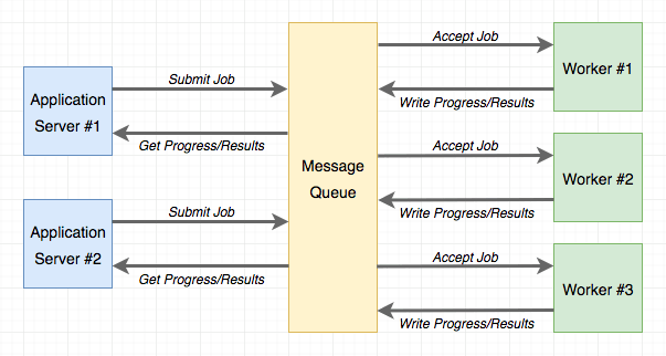 任务队列为后台作业提供了一个便捷的解决方案。 Worker 进程独立于应用程序运行,甚至可以位于不同的系统上。 应用程序和 worker 之间的通信是通过 消息队列 完成的。 应用程序提交作业,然后通过与队列交互来监视其进度。 下图展示了一个典型的实现: