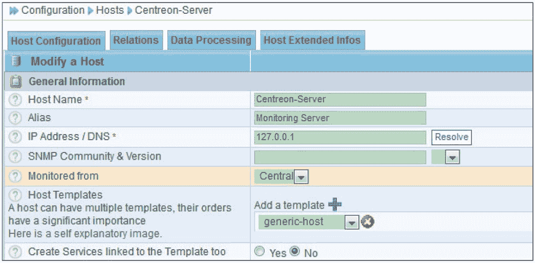 选择“Configuration→Hosts→Centreon-Server”,如图 8-29 所示,这是对 Centreon-Server 主机的定义,其中,“HostName”项就是要监控节点的主机名。“IP Address/DNS”项可以是添加的 IP 地址,也可以是添加主机对应的主机名,只要 DNS 能解析到对应的 IP 就行。“Host Templates”项是为 Centreon-Server 添加的一个主机模板,而“generic-host”模板是默认就存在的,这里可以直接引用。关于这个主机模板,后面会有更详细的介绍。