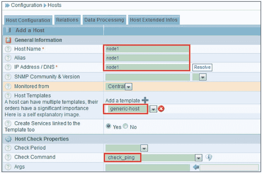 选择“Configuration→Hosts”,单击“Add”添加一台主机,如图 8-31 所示。添加的方法与前面对 Centreon-Server 主机的定义完全相同,首先添加一台 node1 主机,此主机引用的模板仍然是“generic-host”,最后,在“Host Check Properties”项中添加一个用于检测主机状态的命令“check_ping”,这个命令在上面的步骤中已经定义好了,这里直接引用即可。