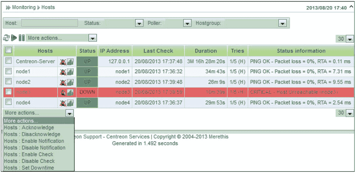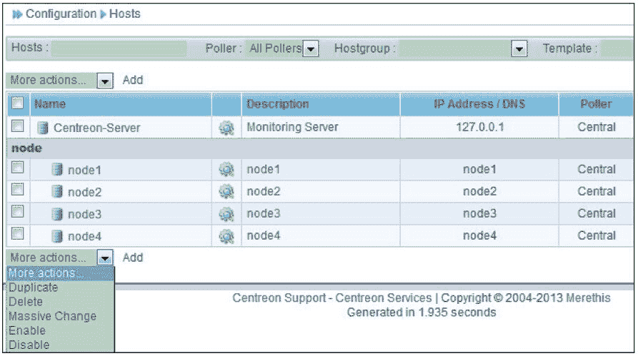 采用与添加 node1 主机完全相同的方法,下面依次添加 node2、node3、node4 三台主机,如图 8-32 所示,这里一共添加了 4 台主机。在这个界面上,有很多操作属性,可以用于对主机进行复制、删除、修改、启用和禁用等,由此可见,通过 Centreon 管理 nagios 非常方便和简单。