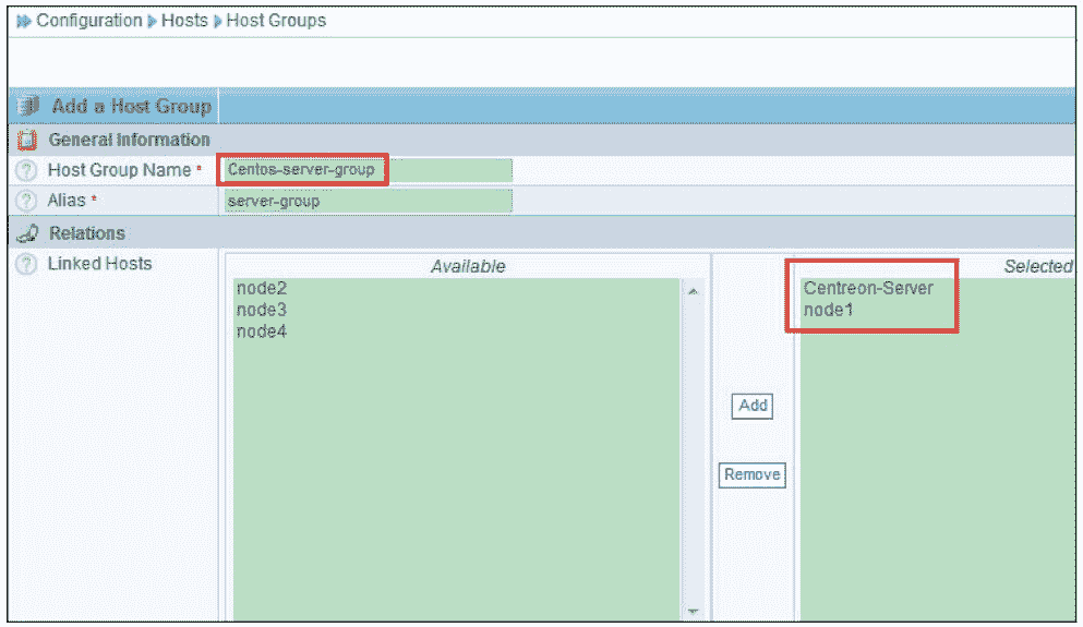从图 8-33 中可以看到,添加了一个名为 Centos-server-group 的主机组,然后将 Centreon-Server 和 node1 主机添加到了这个组中。一台主机可以属于多个主机组。
