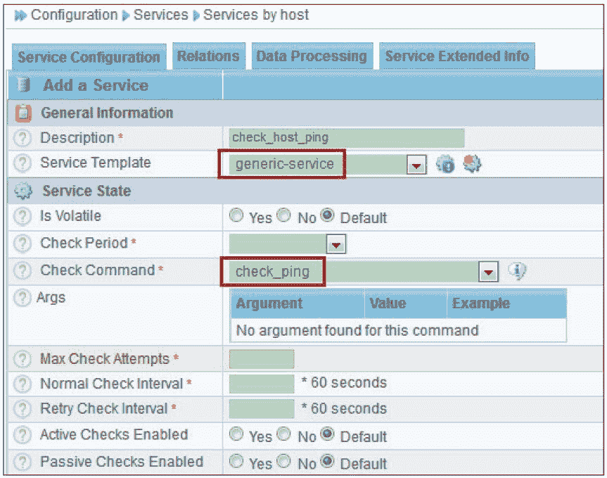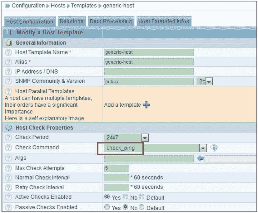 主机模板的一个最大特点是继承性,如果一台主机引用了这个模板,那么此主机模板下的所有监控属性都被自动继承过来,例如要对 1000 台主机做 ping 连通性检查,首先可以创建一个 check_ping 命令(创建方法上面已经介绍过),然后将这个命令引用到 generic-host 模板中,最后在创建主机的时候,所有 1000 台主机都引用 generic-host 这个主机模板即可,如图 8-35 所示。引用主机模板的好处是,如果监控属性发生了变化,只需修改 generic-host 配置即可,而无须一台主机一台主机修改,方便快捷。