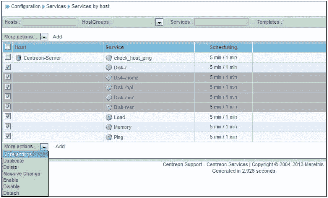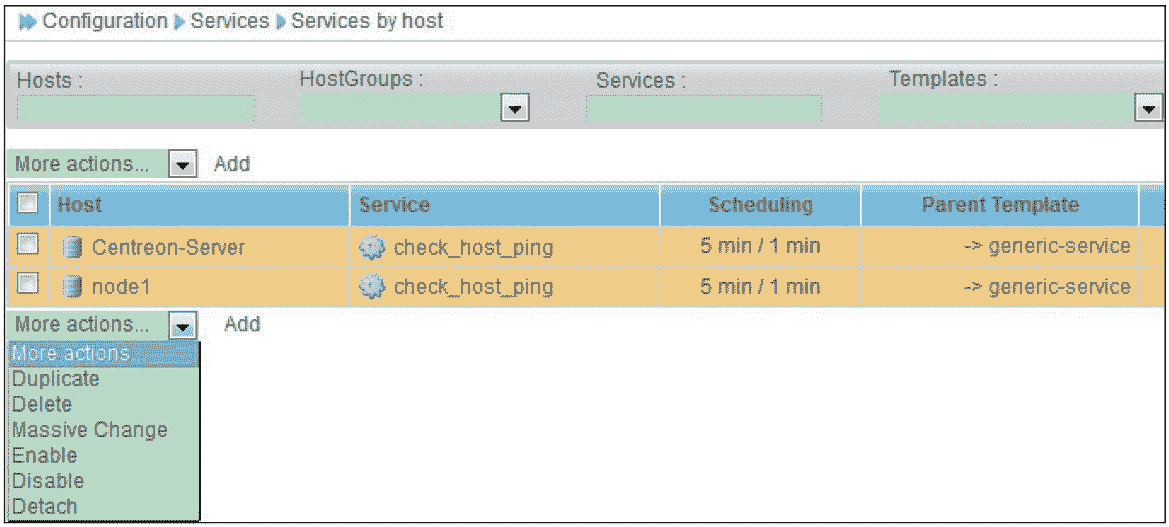 默认情况下,Centreon 在安装完成后,会有一些初始的主机或服务的监控项,为了方便介绍和演示,这里删除所有服务的默认监控:选择“Configuration→Services→Services by host”,删除所有默认监控的服务即可。