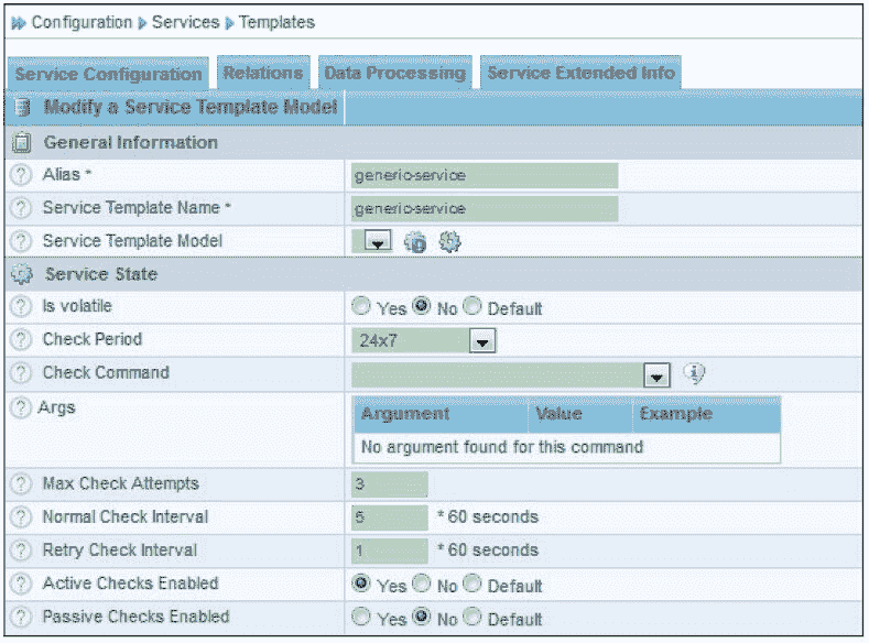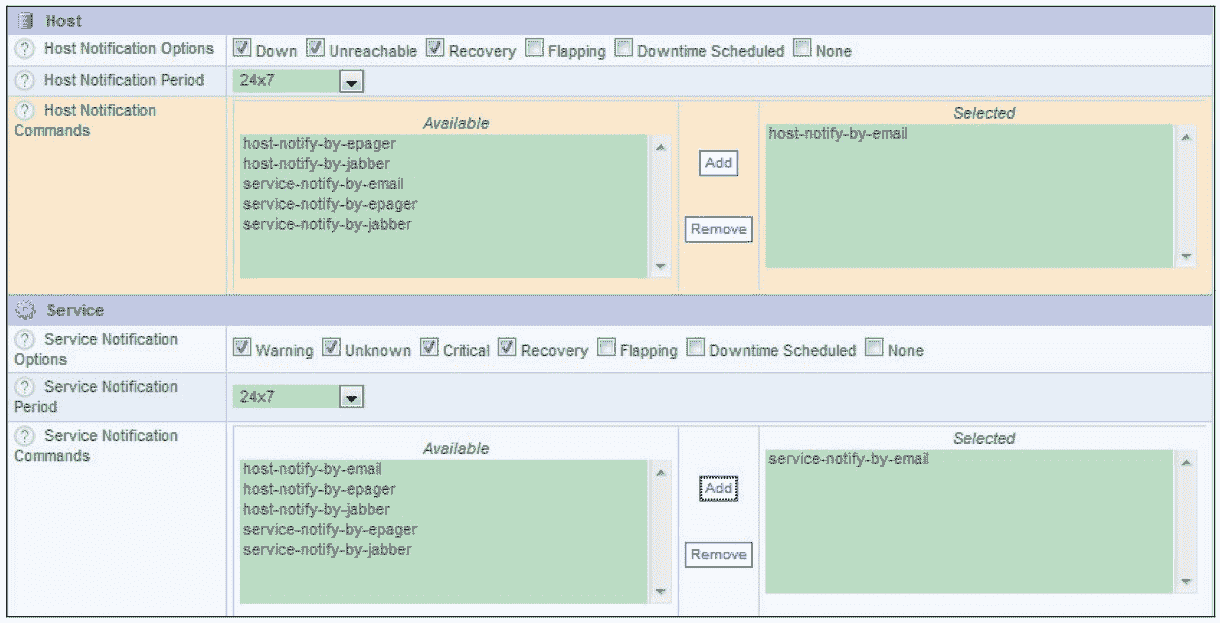 在图 8-35 中,可以看到一些主机检查属性值,例如,“Max Check Attempts”表示最大检查尝试次数;“Normal Check Interval”表示正常检查间隔,单位是分钟;“Retry Check Interval”表示重试检查间隔,单位是分钟。这些主机检查属性值都需要根据实际情况进行修改或添加。
