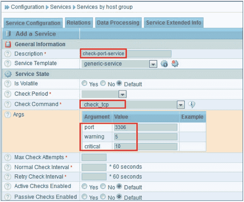 选择“Configuration→Services→Services by host group”,单击“Add”按钮添加一个服务组,如图 8-42 所示。与之前添加服务方式一样,这里添加了一个名为“check-port-service”的服务组,并且应用了 generic-service 模板。
