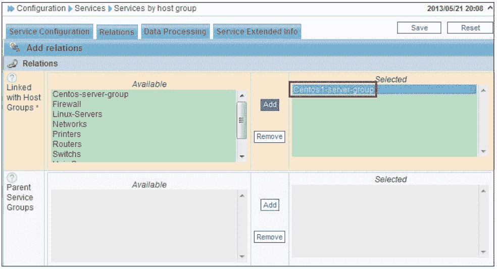 在完成图 8-42 所示页面的设置后,接着选择“Relations”选项,如图 8-43 所示。这里列出了所有已经创建的主机组,可以选择某个主机组与这个服务组相关联,这里选择的是 Centos1-server-group 主机组,单击“Save”完成服务组的创建。