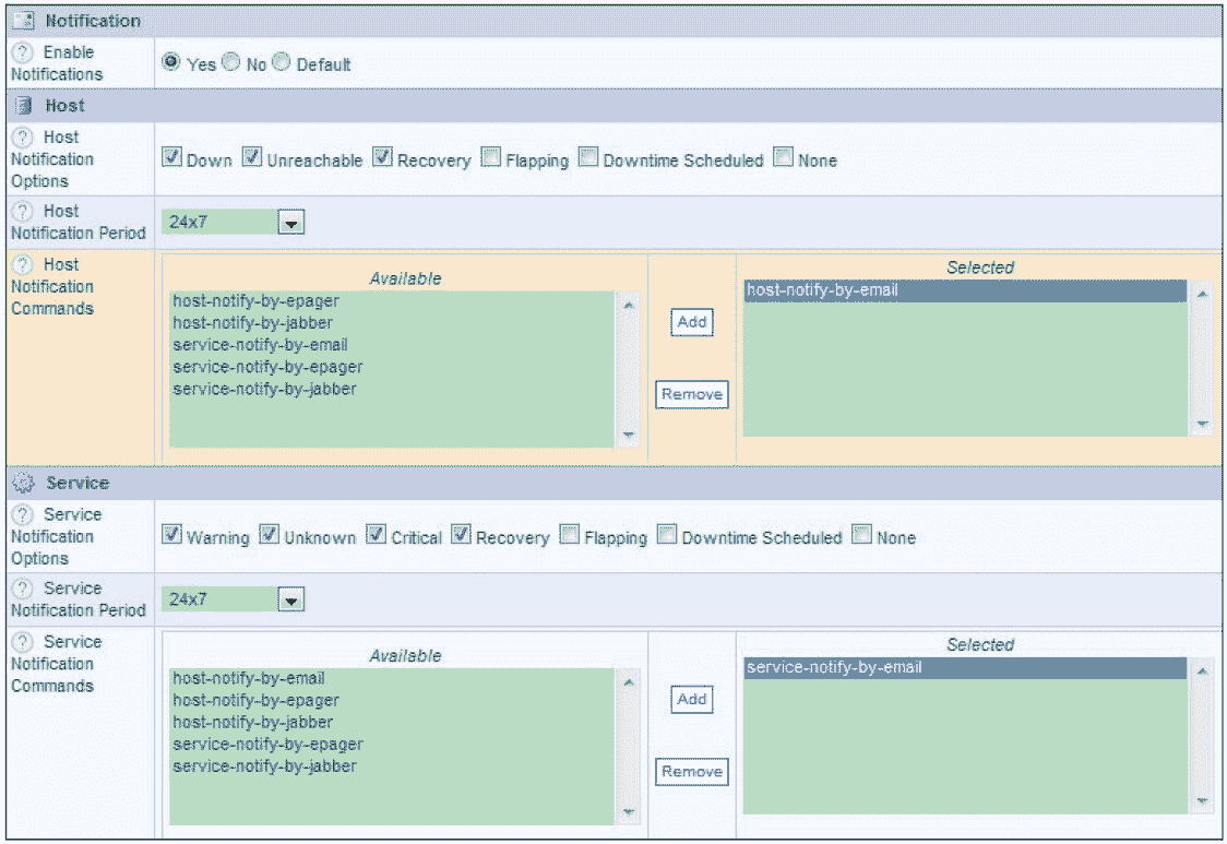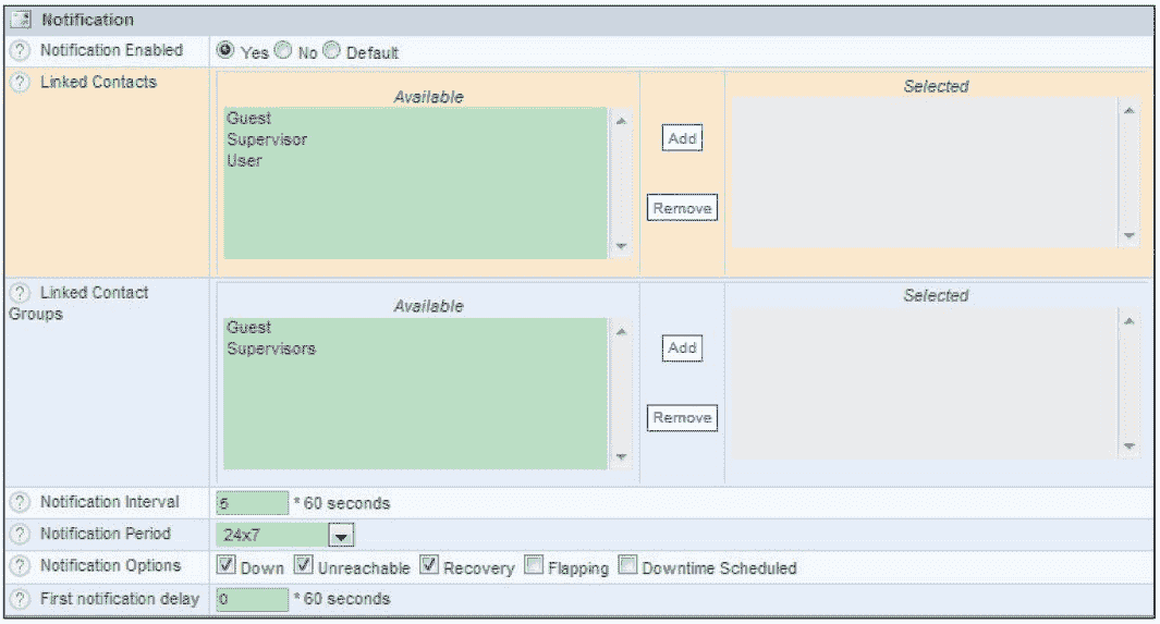 在默认情况下,“Notification Enabled”选项处于“Default”状态,这个状态表示一个继承关系,也就是说如果此主机引用了 generic-host 模板,而在 generic-host 模板中开启了报警通知功能,那么这台主机也就自动继承报警通知功能。同理,如果在 generic-host 模板中没有开启报警通知功能,默认此主机也不会开启报警功能,因此,在主机模板没有开启报警通知功能的时候,就需要在主机定义中指定开启,这里选择“Yes”选项,就开启了主机的报警通知功能。