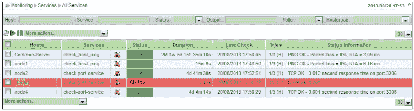 从图 8-48 中可以看出,由于 node3 主机网络故障无法连接导致 node3 上的 MySQL 端口监控服务出现故障,具体的监控出错信息是“No route to host”,这种错误一般都是网络无法连接导致的。