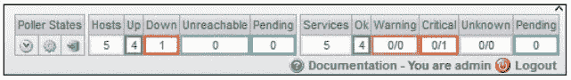 关于对监控状态的查看,Centreon 还给出了一个全局的状态统计,Centreon 后台右上角的一个表格统计了所有主机和服务的运行状态,如图 8-49 所示。