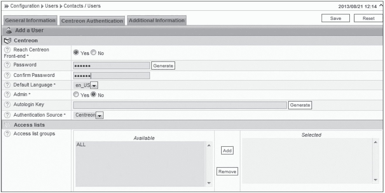 “Centreon Authentication”选项是可选的,如果要开启 ixdba 用户登录 Centreon 平台的功能,就需要设置登录密码等信息,如果添加的用户仅仅是为了接收报警通知,那么无须设置登录密码。在这个标签中还可以设置此用户是否为管理员、登录的默认语言等信息,设置完成,单击“Save”按钮,完成用户添加。