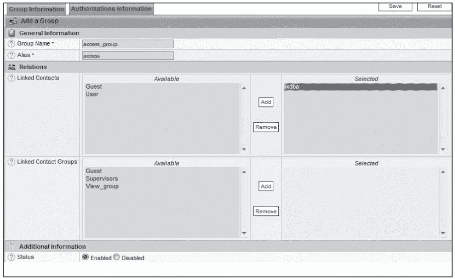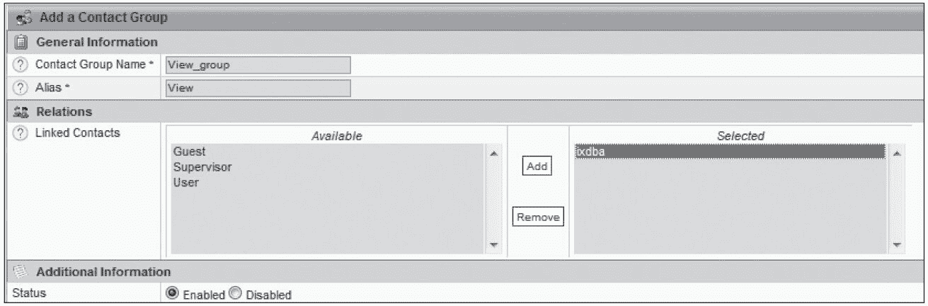 选择“Configuration→Users→Contact Groups”,单击“Add”添加一个用户组,如图 8-53 所示。