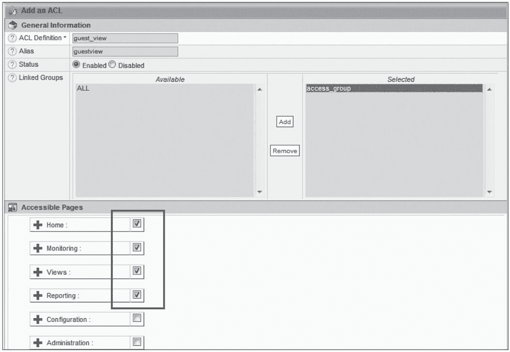 这里添加一个名为 guest_view 的菜单访问权限,从图 10-55 可以看出,此权限只能访问 Centreon 的 Home、Monitoring、Views 和 Reporting 菜单,而对于 Configuration 和 Administration 菜单将无法访问,其实就是只有查看和预览权限,没有添加和修改权限。最后将这个菜单访问权限授予 access_group 访问组,这样 access_group 访问组下的所有用户将只有查看和预览的权限。