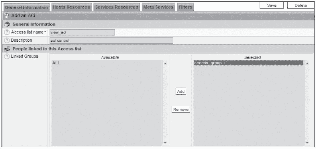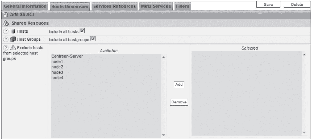 这里添加一个名为“view_acl”的访问策略,并且将 access_group 访问组加入这个访问策略中,接着选择“Hosts Resources”标签,选择可访问的主机资源,如图 8-57 所示。