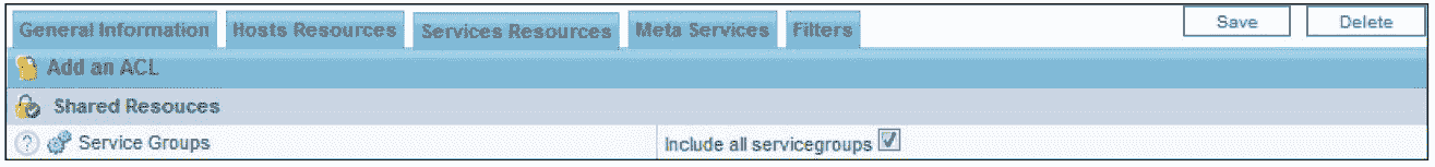 这里选择所有的主机和主机组,当然也可以选择指定的一批主机或主机组,继续选择“Services Resources”标签,选择可访问的服务组,如图 8-58 所示。