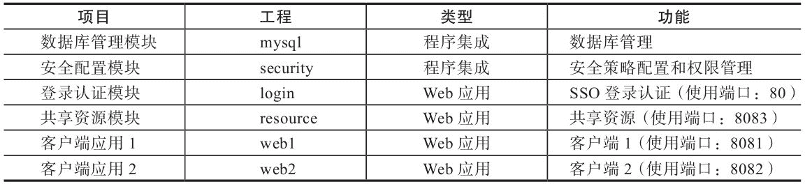 本章的实例工程由于涉及的功能较多,将按照表 6-1,对实例工程实行模块化管理。其中,每个模块都是一个独立的项目,数据库管理模块为其他模块提供数据管理支持,安全配置模块为客户端提供安全配置和授权管理支持,登录认证模块提供单点登录认证(即 SSO)功能,共享资源模块为客户端提供登录用户需要的一些共享资源,两个客户端应用是使用 SSO 系统的两个实例。