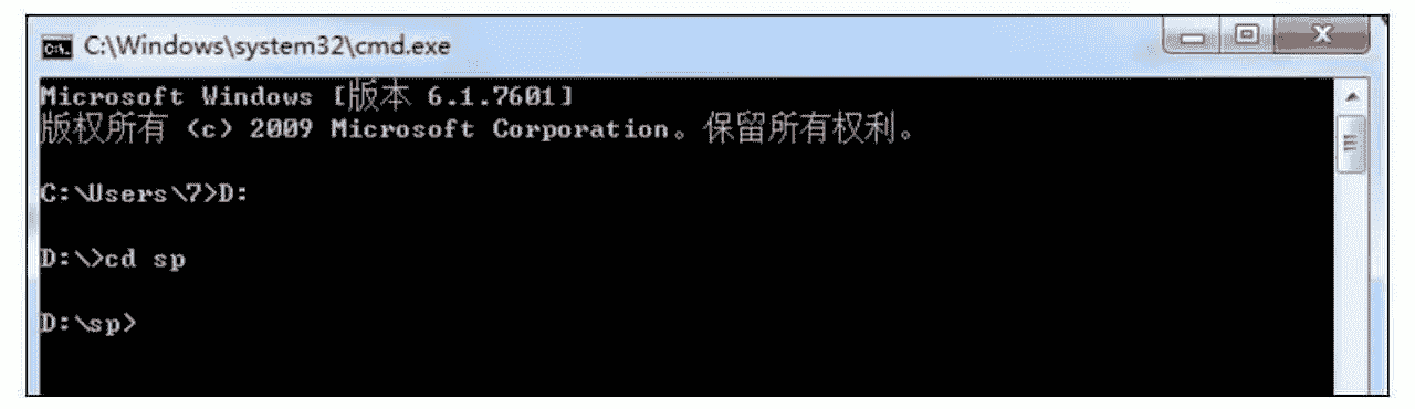 本节用例子来介绍 Scrapy 目录结构、讲解 Scrapy 的用法。现在假如要使用 Scrapy 爬取百度首页右上角的栏目名称和其 URL,首先从命令行进入准备放置爬虫项目的目录。例如,爬虫项目准备放在 D 盘 sp 这个文件夹下,进入命令行,输入 D:并按回车键,然后输入 cd sp 并按回车键,进入 sp 这个文件夹,如图 9-2 所示。