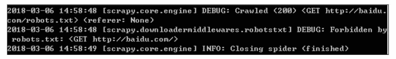 这样就运行了 Scrapy 百度爬虫,但是读者可能没有在屏幕上看到打印结果,而是发现类似 Forbidden by robots.txt 这样的提示,如图 9-4 所示。