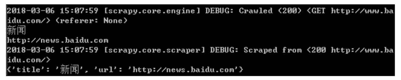 '//*[@id="u1"]/a[1]/@href').extract_first()这里使用了 extract_first() 提取第一个数据,这种方法比前面提取 title 所使用的 extract()[0]方法更好,因为如果没有匹配的元素,extract_first 方法会返回 None,而 extract()[0]则会直接报错。为了让读者看到提取的结果,下面把提取的数据打印出来。