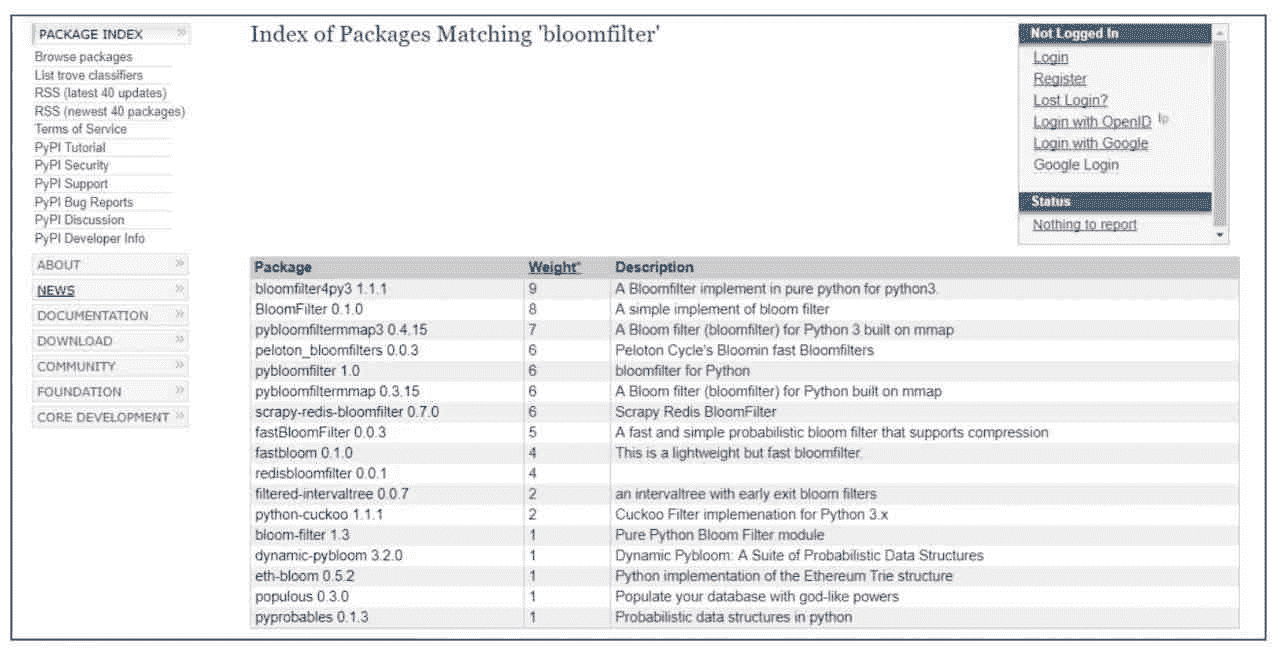 可以在 Python 官网搜索,看看有没有已经实现 Bloom Filter 的包。输入 Bloomfilter,搜索结果如图 15-10 所示。