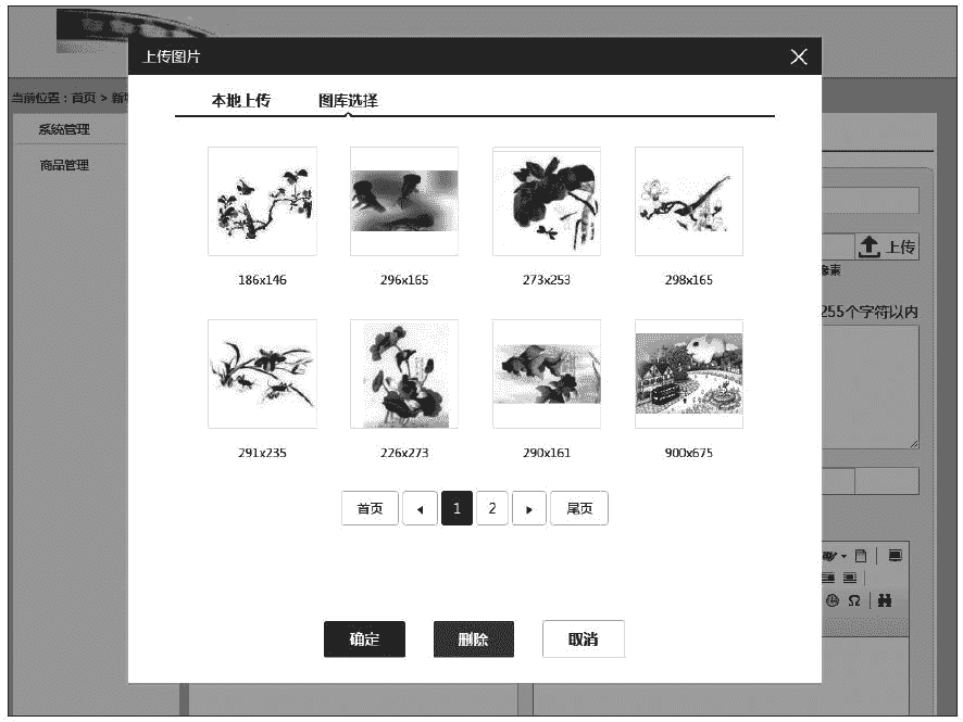 最后完成的效果如图 7-4 所示。这样,当在图片中单击选择一张图片后,再单击确定按钮即可使用这张图片,单击删除按钮将删除这张图片。