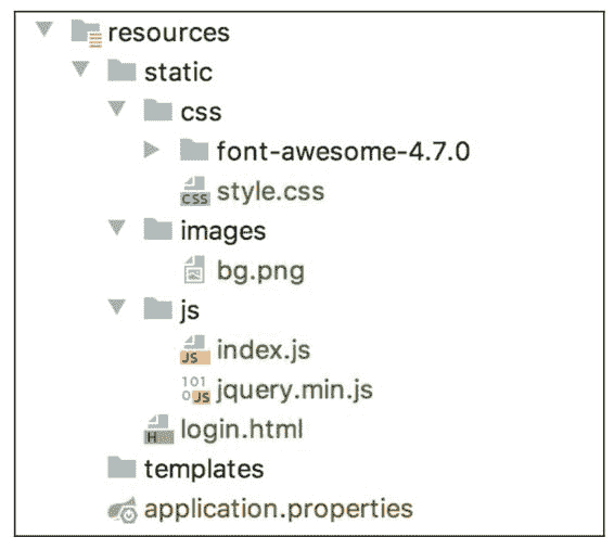 回顾 4.1.3 小节中关于 WebSecurity 的讲解,提到它里边维护了一个 ignoredRequests 变量,该变量记录的就是所有需要被忽略的请求,这些被忽略的请求将不再经过 Spring Security 过滤器。例如,笔者的静态资源目录结构如图 4-10 所示。