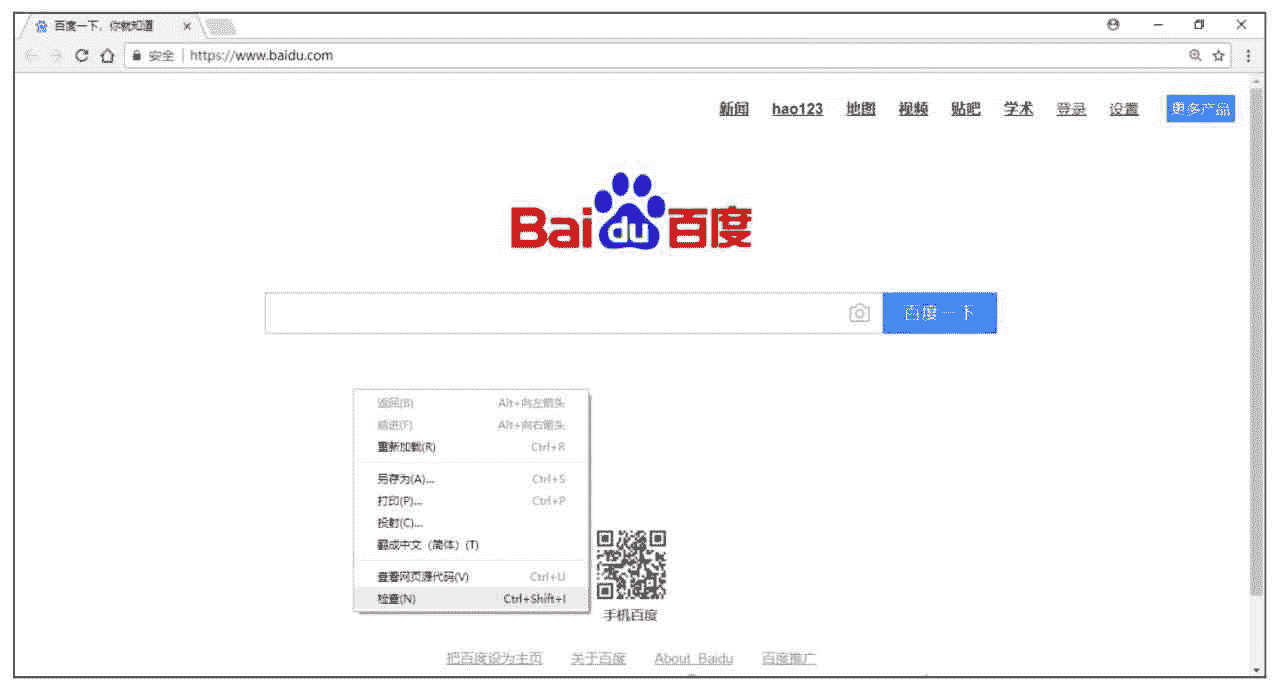 可以打开一个网页,实际查看一下浏览器的请求头部。打开 Chrome 或 Firefox 浏览器,在网页空白处单击右键,选择“检查”(见图 2-1)或“查看元素”。
