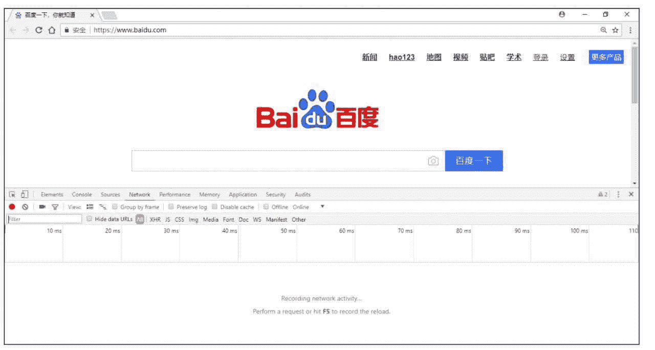 单击“检查”之后,浏览器下方弹出一个子页面,单击子页面上方菜单中的 Network,如图 2-2 所示。