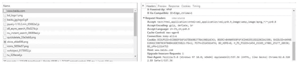 向下拉右侧滚动条,就能看到 Request Headers 的内容,也就是请求头部,如图 2-4 所示。