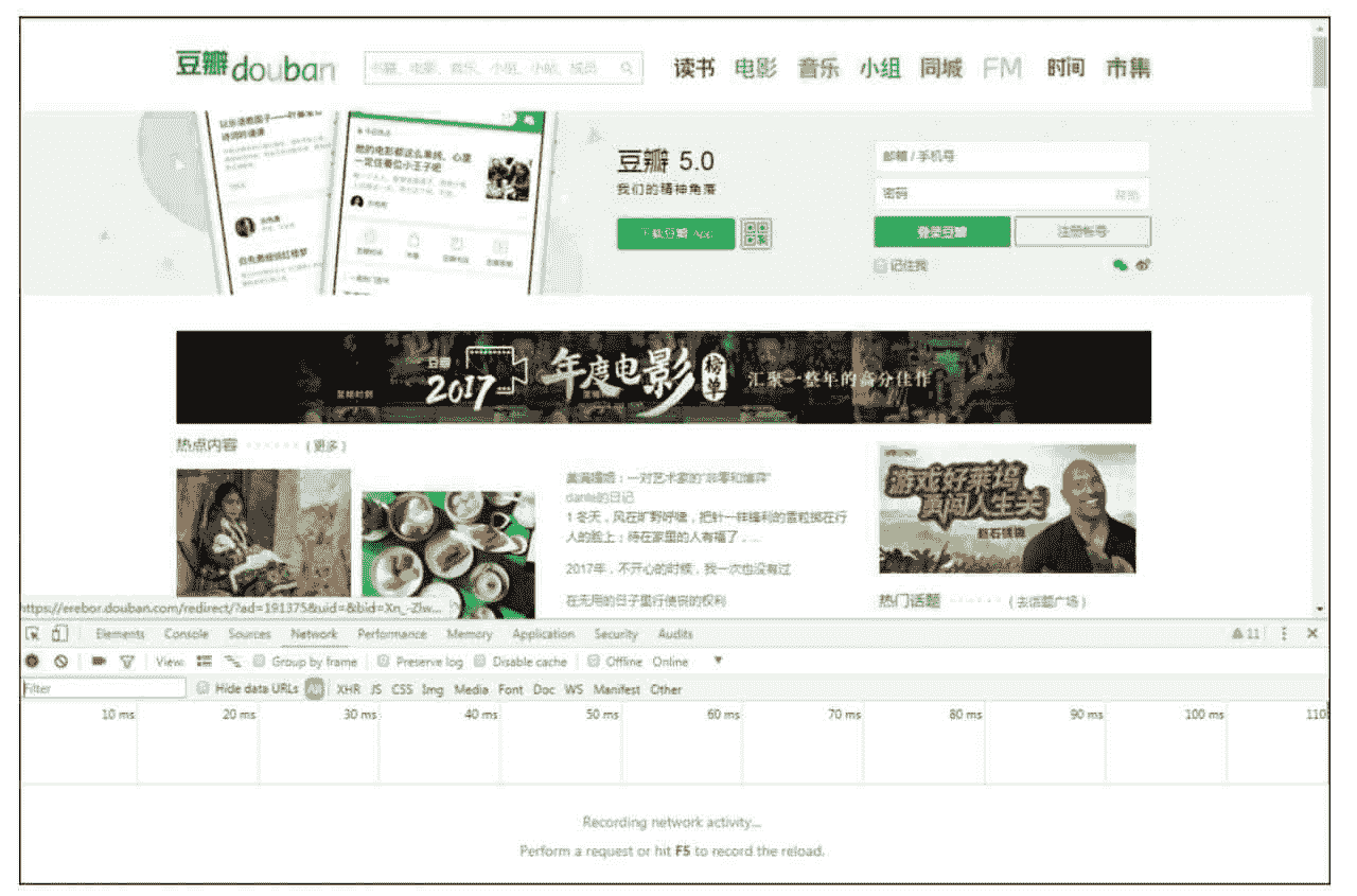 在 Chrome 浏览器中打开豆瓣首页,可以看到在右上角有登录的输入框,现在在网页的空白处单击右键,在弹出的菜单中选择“检查”,这时候在网页下方(或右侧)弹出了检查页面。在检查页面顶部的菜单中选择 Network,如图 5-3 所示。