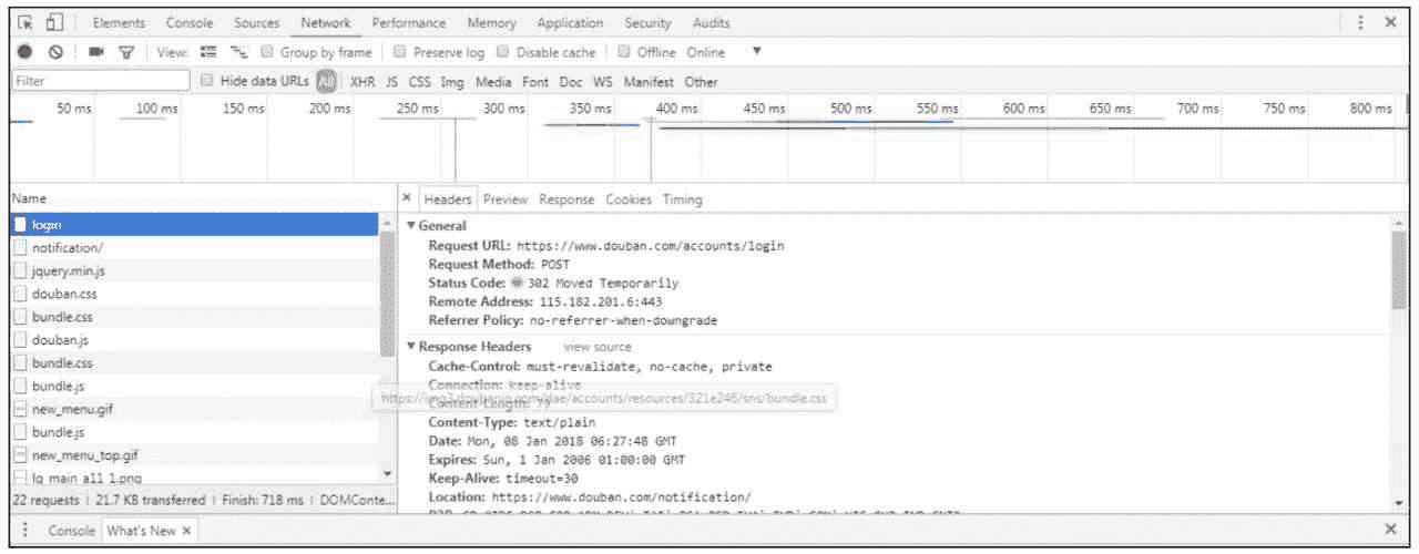 Network 这一栏会记录网络请求情况,如登录、下载的链接详情等。现在输入用户名和密码,然后单击“登录豆瓣”。可以看到 Network 栏目下出现非常多的请求链接信息,把滚动条拉到最上面,能看到最开始请求的链接,Name 为 login。单击这个 login,右侧会显示 login 这个请求的 Headers 详细信息,如图 5-4 所示。