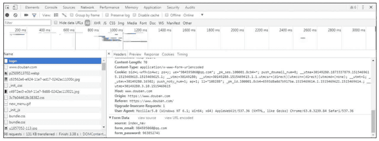 这些信息说明,登录的过程实际上是向 https://www.douban.com/accounts/login 这个网址发起了 POST 请求。那么到底向服务器 POST 了什么数据呢?把滚动条拉动到最下面,可以看到系统到底 POST 了哪些数据到服务器,如图 5-5 所示。Form Data 这一项中的信息就是实际向网站提交的信息。Form Data 现在只有 3 项内容。