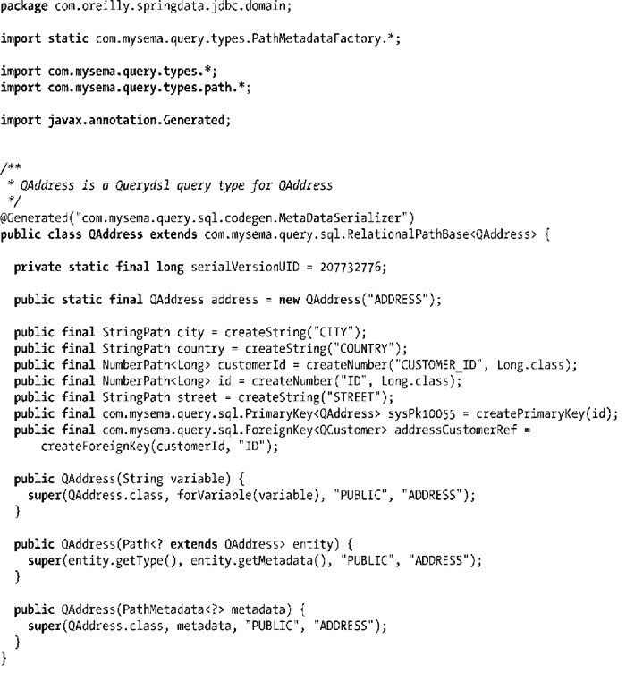 示例 5-2 展示了基于 address 表所生成的查询类型。它有多个构造函数、针对每列的 Querydsl 路径表达式、创建主键和外键类型的方法并提供了 QAddress 类型实例的静态域。