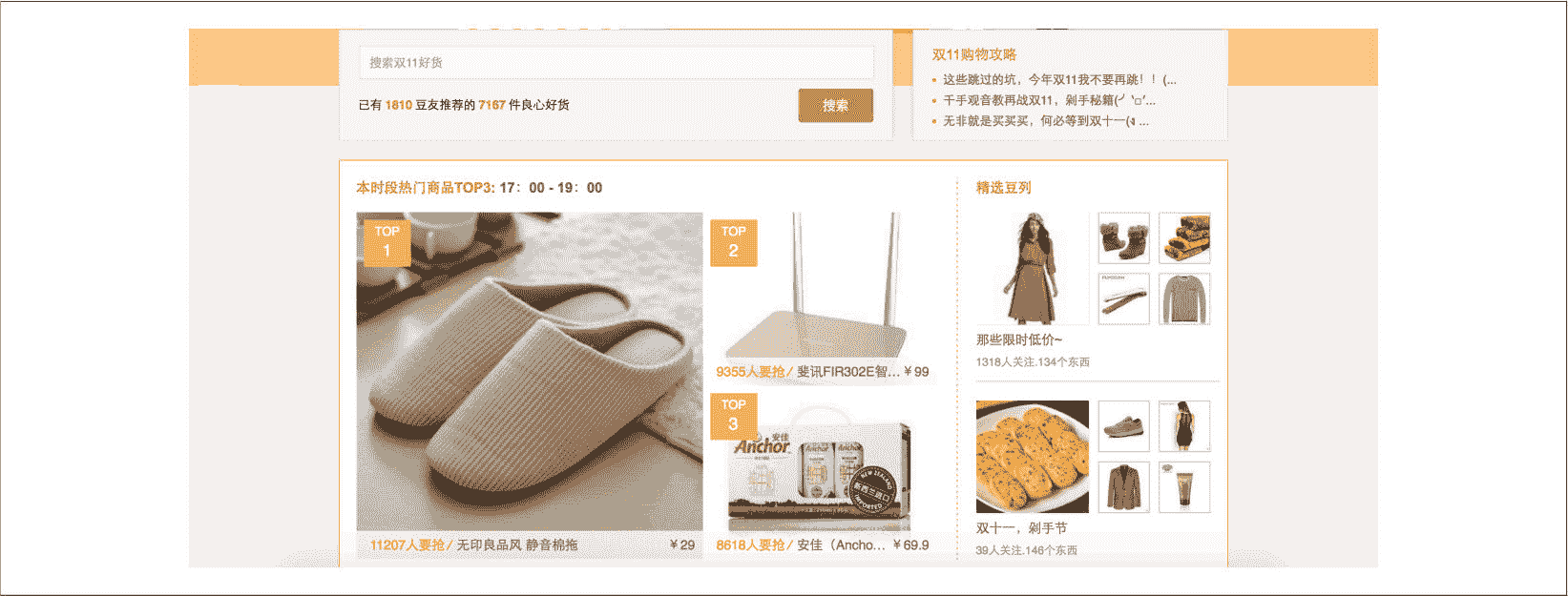 之前深入介绍了 IPython、Pandas 等工具,那么它们在 Web 开发中又能发挥怎样的作用呢?豆瓣东西是豆瓣的电商导购产品,为了刺激用户消费、提高营收,豆瓣东西会不间断地在一些重要节日做一些专题活动,而“双十一”这一天也不例外。先看一下 2014 年双十一专题页面(https://dongxi.douban.com/special/2014/1111/ )的一部分,如图 12.11 所示。