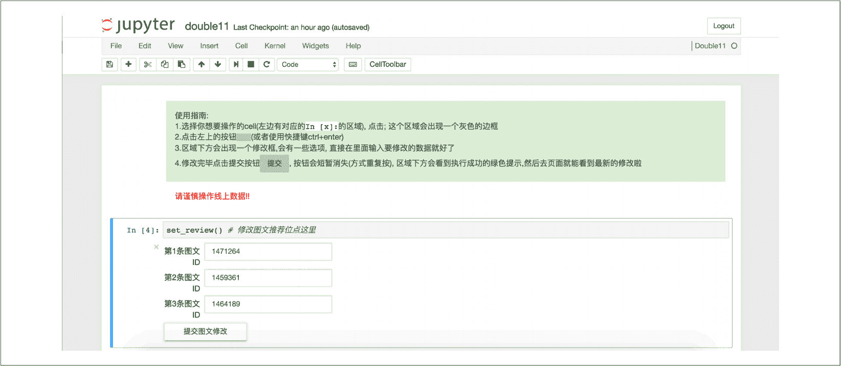 其中第一个 Cell 是使用指南。它是一段 Markdown 类型的 Cell,内容是一段 HTML 代码: