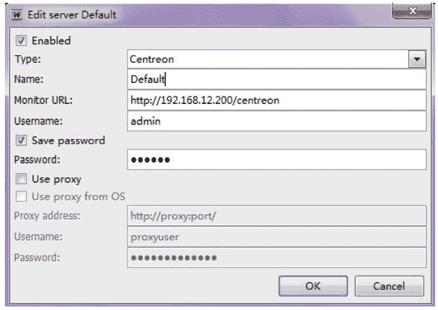 打开 Nagstamon,选择“Servers”标签,单击“New server”按钮添加一个监控,如图 8-80 所示。这里添加一个类型为 Centreon 的监控,在“Monitor URL”中输入 Centreon 监控服务器的 Web 访问地址即可,然后依次输入登录 Centreon 后台的用户名和密码,单击“OK”保存退出。