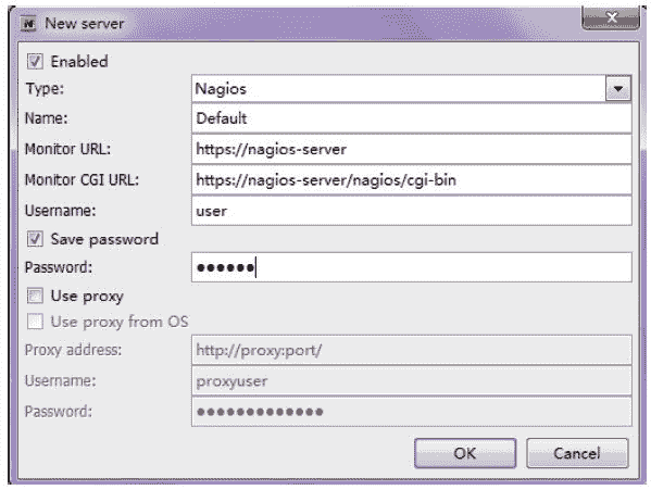 如果仅仅是对 nagios 进行监控,可以选择“Type”为 Nagios,然后依次输入“Monitor URL”和“Monitor CGI URL”,如图 8-81 所示。这里重点关注下两个 URL 地址,最后输入登录 nagios Web 的用户名和密码即可。