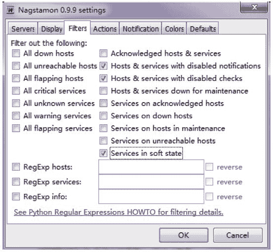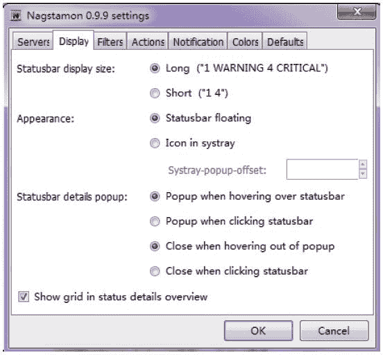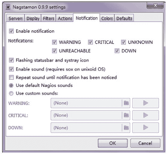 在前面的章节,介绍过 Centreon 报警的方式,例如通过邮件、短信等方式发送报警信息,这里再介绍一种报警方式,即通过 Nagstamon 这个小软件实现通过颜色和声音的方式进行报警。Nagstamon 是一个开源的桌面监控工具,支持 Windows、Linux 和 Mac OS X 平台,通过 Nagstamon 可以监控 nagios 运行状态。同时 Nagstamon 还支持多种监控引擎,常见的有 Icinga、Opsview、Centreon、Op5 Monitor/Ninja、Check_MK Multisite 等。更详细的信息可以参考 Nagstamon 官网:http://nagstamon.ifw-dresden.de/。这里下载一个 Windows 下的版本 Nagstamon 0.9.9,安装完成后做一个简单的配置即可。