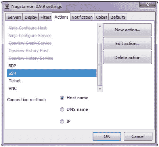接着看“Actions”标签,如图 8-84 所示,这个标签主要用于定义一些连接服务器的工具,例如 SSH、Telnet、NVC 等,通过定义这些工具,可以在某台服务器出现故障时快速连接。